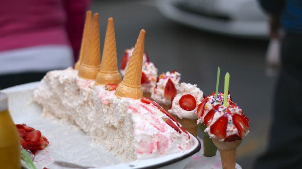 Sirva la espumilla inmediatamente en copas o conos de helado, acompañe con la salsa de mora, grajeas y coco rallado.